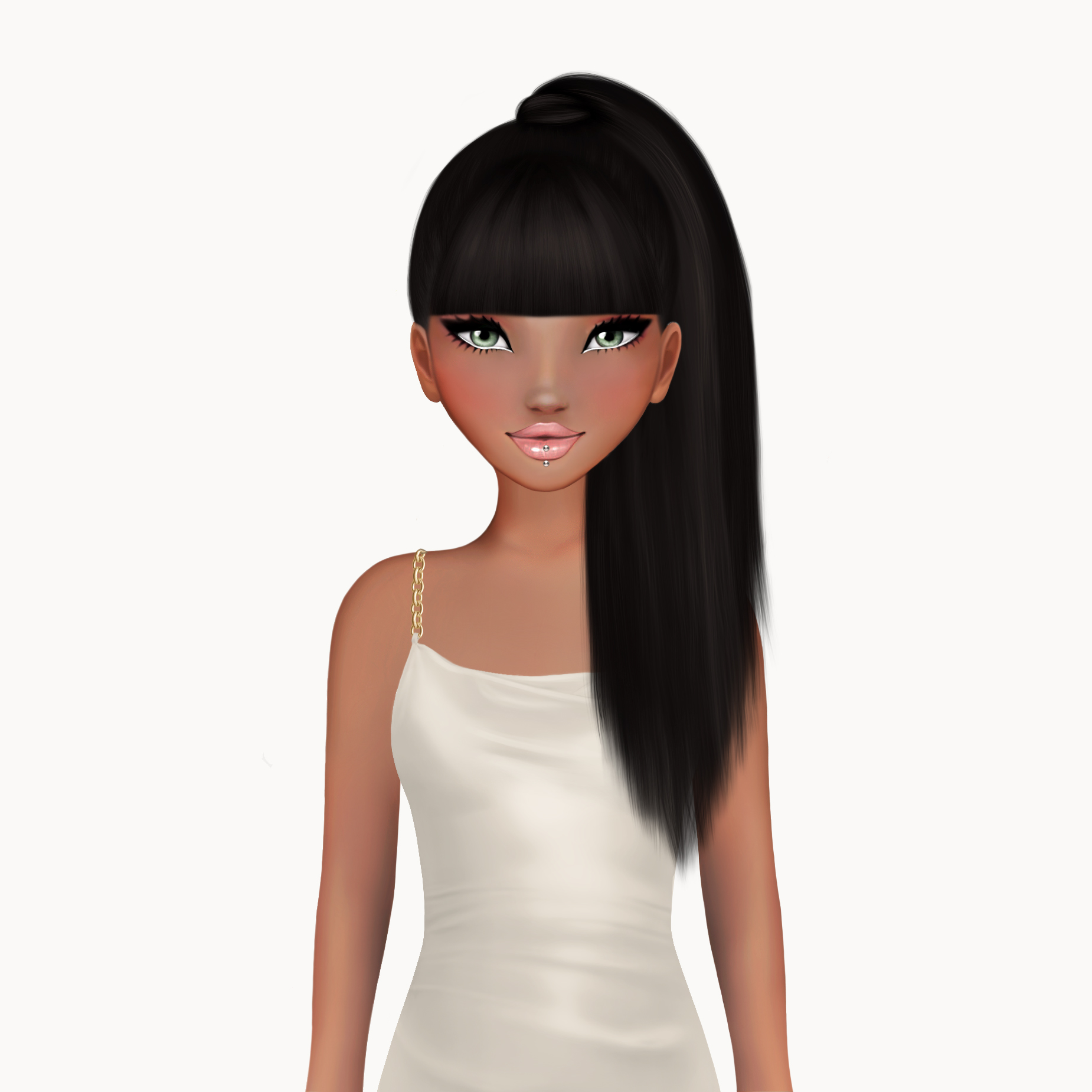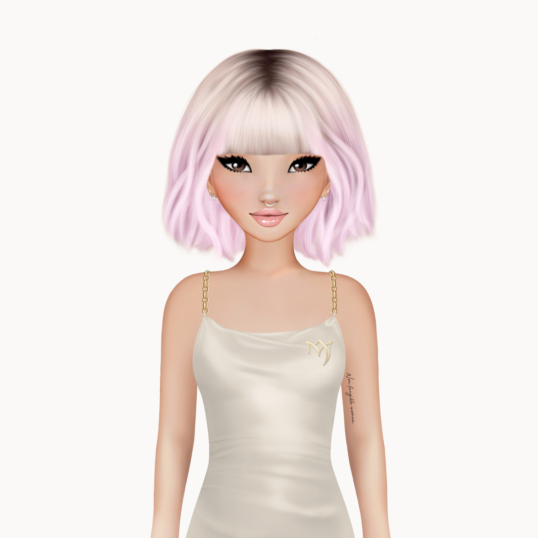 Mit luxuriös schimmerndem Satinstoff, ikonischem Wasserfallausschnitt und goldenen Chain-Straps verbindet dieses digitale IT-Piece zeitlose Eleganz mit maximaler On-Chain-Attitude.